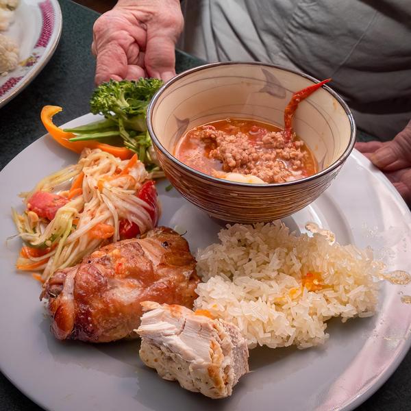 That might include a pinch of Papaya Salad. Or you might scoop up some of the Sweet and Sour Ground Pork with Shrimp that smells so tasty. The point here is that you build up a much more personal relationship with food when you pick it up with your fingers.