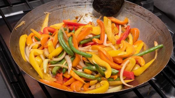 A vibrant and flavorful Thai stir-fry showcasing a medley of crisp-tender vegetables coated in a savory chili sauce. This simple yet satisfying dish features a colorful combination of green peppers, red peppers, onions, and green beans, enhanced by the umami notes of oyster sauce. A harmonious blend of fish sauce, chicken stock, black bean sauce, sesame oil, chili