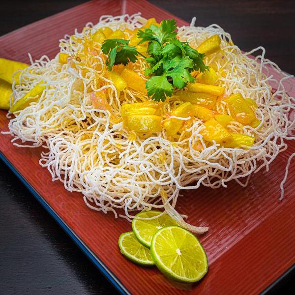 vegan class! That might seem an odd thing to say but you'll know what I mean when you watch the rice noodles (which pose as Grandma's Hair) when they are dropped into the hot Canola oil! Snap! Crackle! Pop! and Sizzle! as the noodles hit the oil. It's always fun.