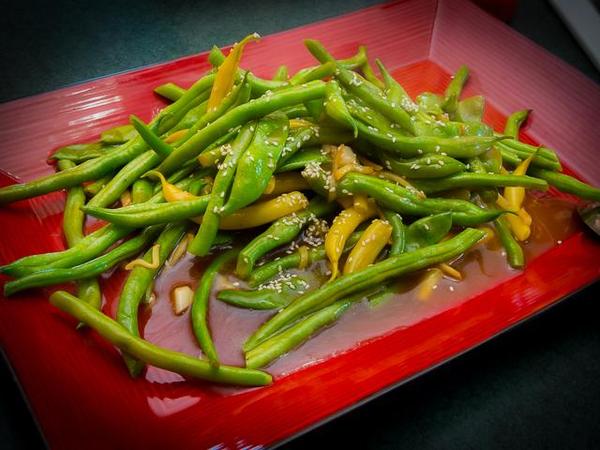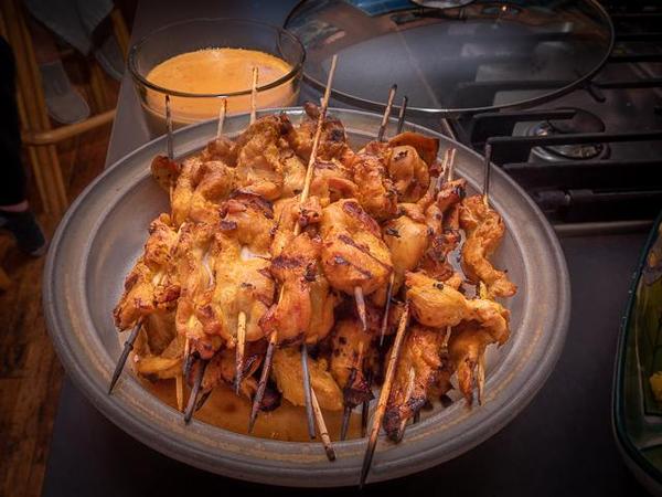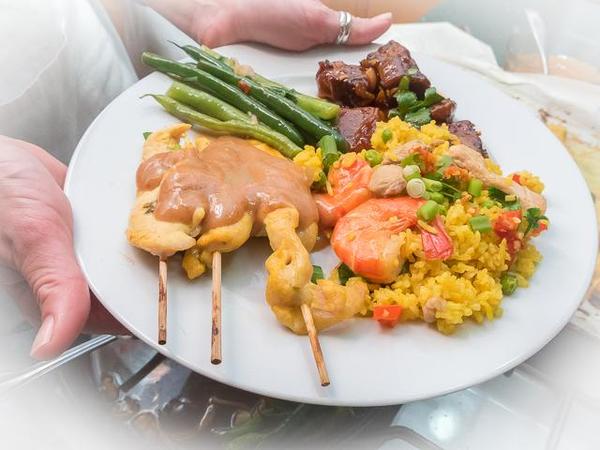 A dinner serving of Thai Sweet & Sour Ribs, Chicken Satay, Green Beans and Thai Fried Rice.