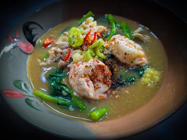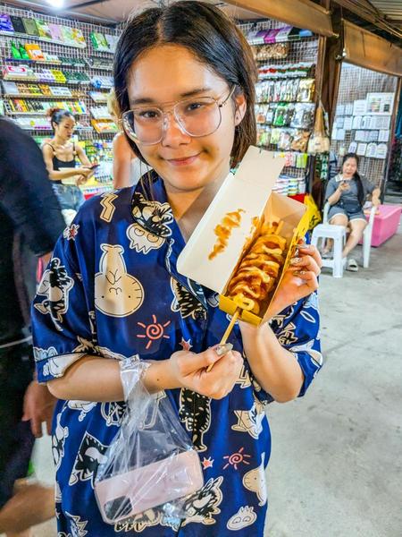 so fresh they still tasted of the Gulf of Thailand, charred over charcoal. Then came the marinated pork skewers—sweet, smoky, and perfect for sharing. And, of course, the staples: a mountain of green papaya salad, the sharp lime and chili waking us up, served with baskets of warm sticky rice.